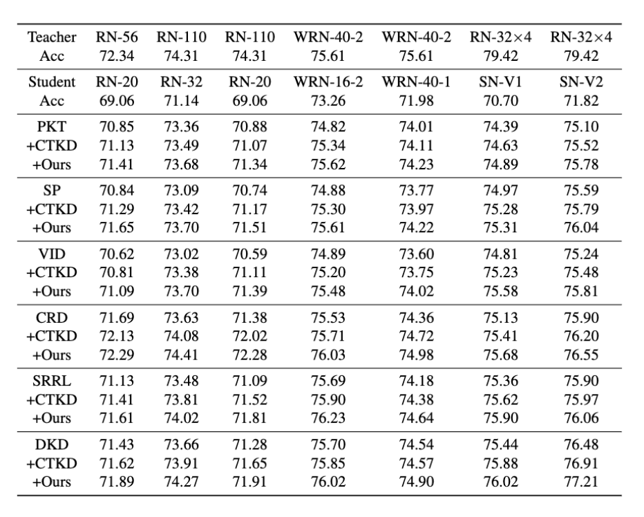 Student network top-1 accuracy on CIFAR-100. Testing the performance of Vanilla KD as well as Vanilla KD with the incorpora- tion of instance temperature adjustment using CTKD and our RLKD, respectively